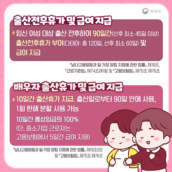 임신 여성 대상 출산 전후하여 90일간(산후 최소 45일 이상) 출산전후휴가 부여(다태아: 총 120일, 산후 최소 60일) 및 급여 지급