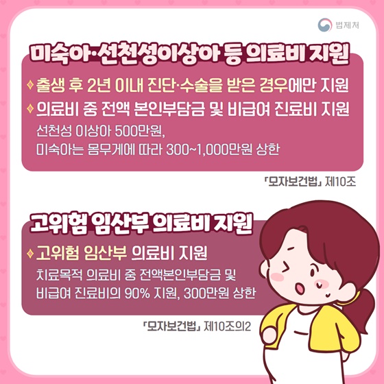 영유아 지원: 출생일부터 2년 이내의 영유아 진료 및 처방에 의한 약제․치료재료 구입 비용