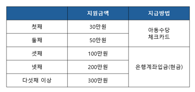혜택: 첫째 30만 원, 둘째 50만 원, 셋째 100만 원, 넷째 200만 원, 다섯째 이상 300만 원