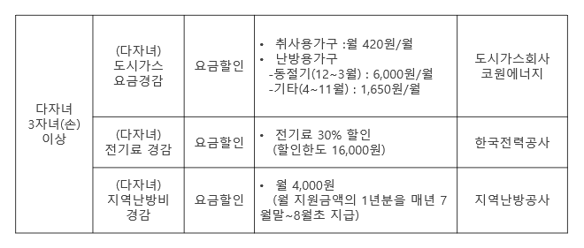 지원대상 : 출산가정, 다자녀 가정(자녀 3명 이상), 대가족(5인 이상 가족)